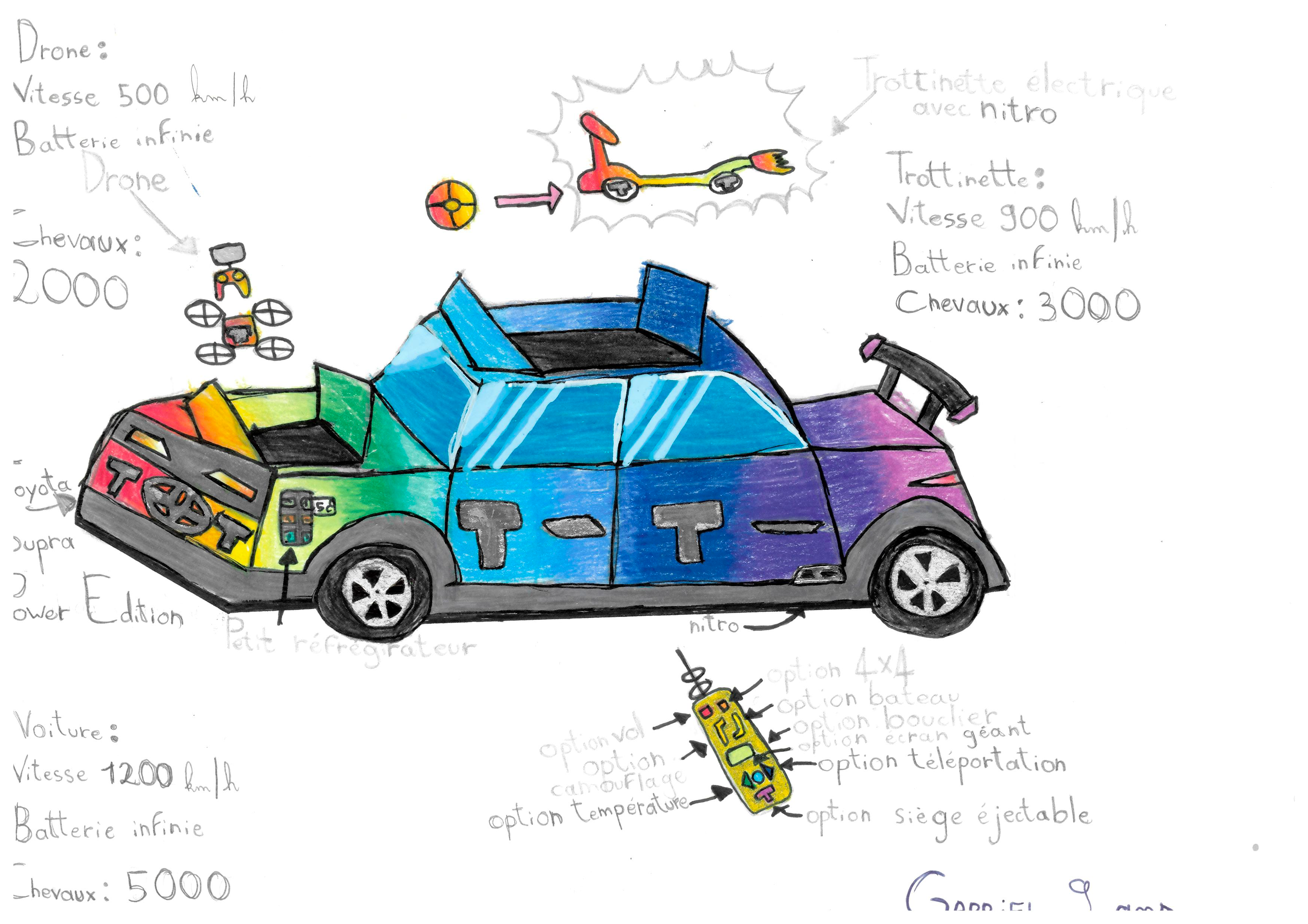 Ma voiture de rêve est une voiture amphibie et volante pour me déplacer sous l'eau comme dans les airs en toute liberté. Elle possède des phares écologiques bioluminescents et un périscope pour plus de sécurité.